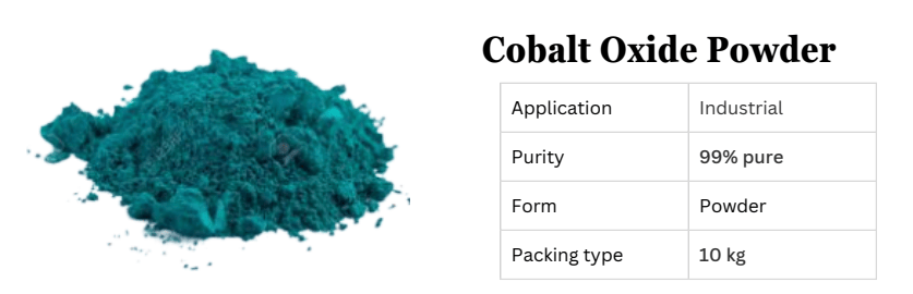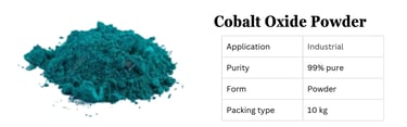 Ceramics and Glass - Used to create deep blue hues in pottery, porcelain, and glass. It is often preferred over cobalt carbonate for its higher concentration of cobalt.
