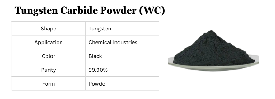 Chemical composition of wc tungsten carbide powder : W≥99.9%, Al≤0.001%, AS≤0.001%, Bi≤0.0003% C≤0.003%, Cd≤0.003%, Co≤0.003%, Cr≤0.002%, Cu≤0.003%