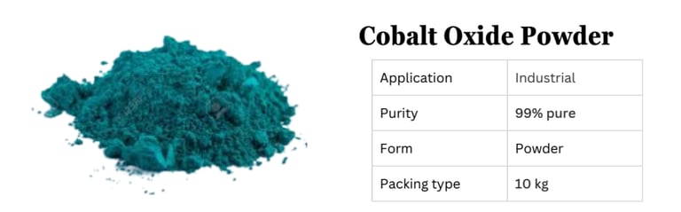 Ceramics and Glass - Used to create deep blue hues in pottery, porcelain, and glass. It is often preferred over cobalt carbonate for its higher concentration of cobalt.